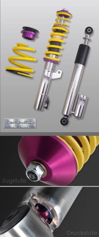 KW clubsport Gewindefahrwerke für Straße und RennstreckeKW clubsport wurde speziell für Kunden entwickelt, die mit ihrem Straßenfahrzeug auf der Rennstrecke z.B. bei Touristenfahrten, Sportfahrerlehrgängen oder sonstigen Tracksportveranstaltungen teilnehmen und gleichzeitig eine Straßenzulassung wünschen, um ihr Fahrzeug auch im öffentlichen Straßenverkehr einsetzen zu können. Das Setup wurde speziell für die Nordschleife und den Einsatz von Sportreifen ausgelegt. Die Einstellmöglichkeiten in der Höhe ermöglichen eine Anpassung der Radlasten. Mittels der optional erhältlichen einstellbaren Stützlager kann die Achsgeometrie auf die Bedürfnisse der Reifen und des Einsatzzweckes angepasst werden. Die vorgenannten Einstellmöglichkeiten kombiniert mit der separat in Druck- und Zugstufe verstellbaren Dämpfungstechnik ermöglicht individuelle Setupanpassungen passend zum Fahrzeuggewicht, der Reifencharakteristiken, unterschiedliche Streckenbeschaffenheiten und Einsatzbedingungen. Somit erfüllt KW Clubsport alle Ansprüche an ein Gewindefahrwerk zum Einsatz auf der Straße und der Rennstrecke.