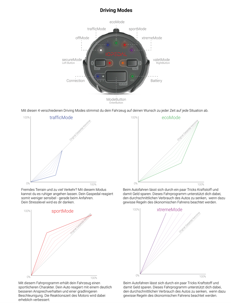 Die PedalBox von IO verbessert die serienmäßig vorprogrammierte Gaspedalkennlinie des Herstellers. Wie funktioniert das? Über die Programmtaste können vier verschiedene Fahrmodi "I","II", "III" und "IV" gewählt werden. Für Feinjustierungen stehen, innerhalb der Fahrmodi, weitere fünf Leistungsstufen bereit.